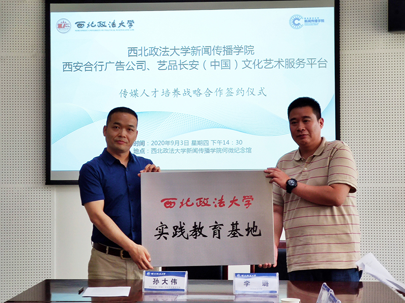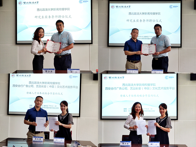 2020年9月3日下午,明升M88 与西安合行广告公司、艺品长安(中国)文化艺术服务平台在何微纪念馆举行传媒人才培养战略合作签约暨研究生实务导师聘任仪式,西安合行广告公司创始人郑少云、艺品长安(中国)文化艺术服务平台董事长孙大伟,明升M88 院长孙江教授等明升M88 领导班子成员、各系主任和学生代表参加了会议,会议由副院长陈琦主持。