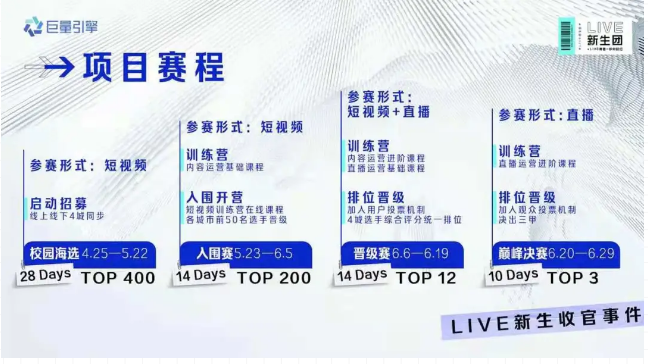 此次校园短视频主播大赛,分为海选、入围赛、晋级赛、巅峰决赛四个阶段,报名通道于5月1日开启。