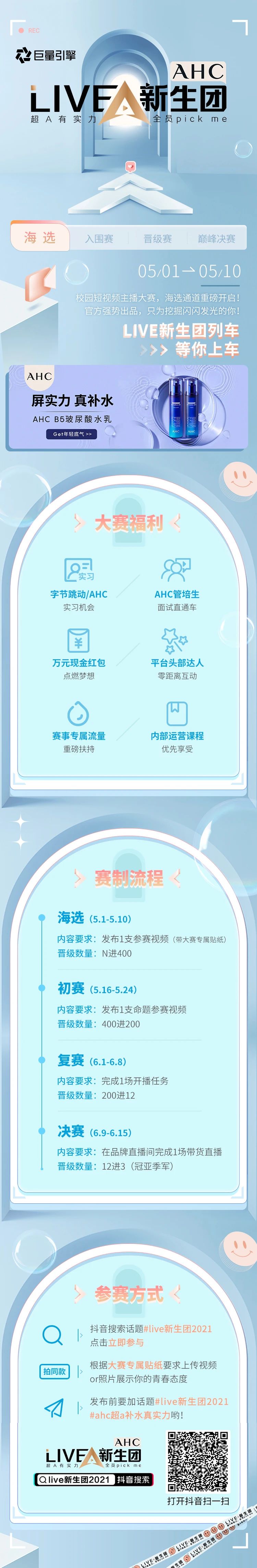 赛事采取线上报名的方式,全国在校大学生仅需拍摄制作一条参赛短视频,并加话题#LIVE新生团#后在抖音平台发布即视为成功报名。至此,一场属于大学生的精彩创意短视频PK即将上演!