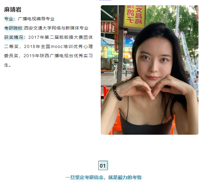 麻靖岩表示考研使自己变的更加自律和自信,在未来的研究生生活中她会继续保持这份初心,让自己充实有意义的完成学业。不惧怕失败,以毅力磨平高山。满怀热枕,坚定目标,自信的跨出每一步。