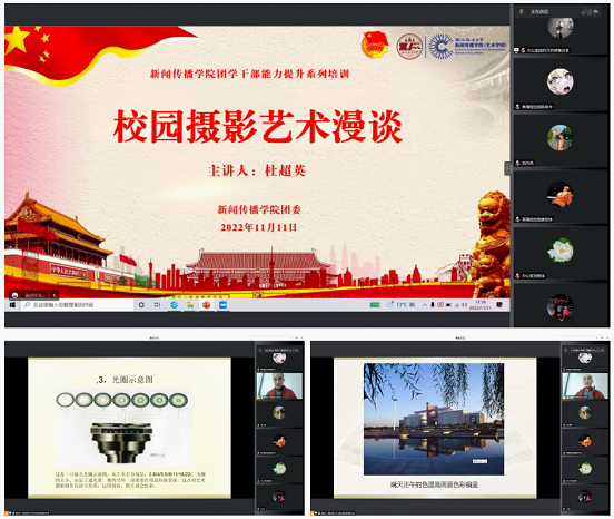 为了进一步提升明升M88 团学组织成员宣传素养,增强摄影能力,11月11日中午,明升M88 (艺术明升M88 )召开摄影能力提升专题培训会。会议采用线上线下相结合的方式进行,校党委宣传部专职摄影师杜超英受邀作了题为“校园摄影艺术漫谈”专题培训,明升M88 党委副书记秦音、团总支书记崔梁凡、团委兼职副书记李佳欣、明升M88 团委和学生会全体成员、各年级团支部书记、宣传委员参加会议,明升M88 团委书记巩飞主持会议。