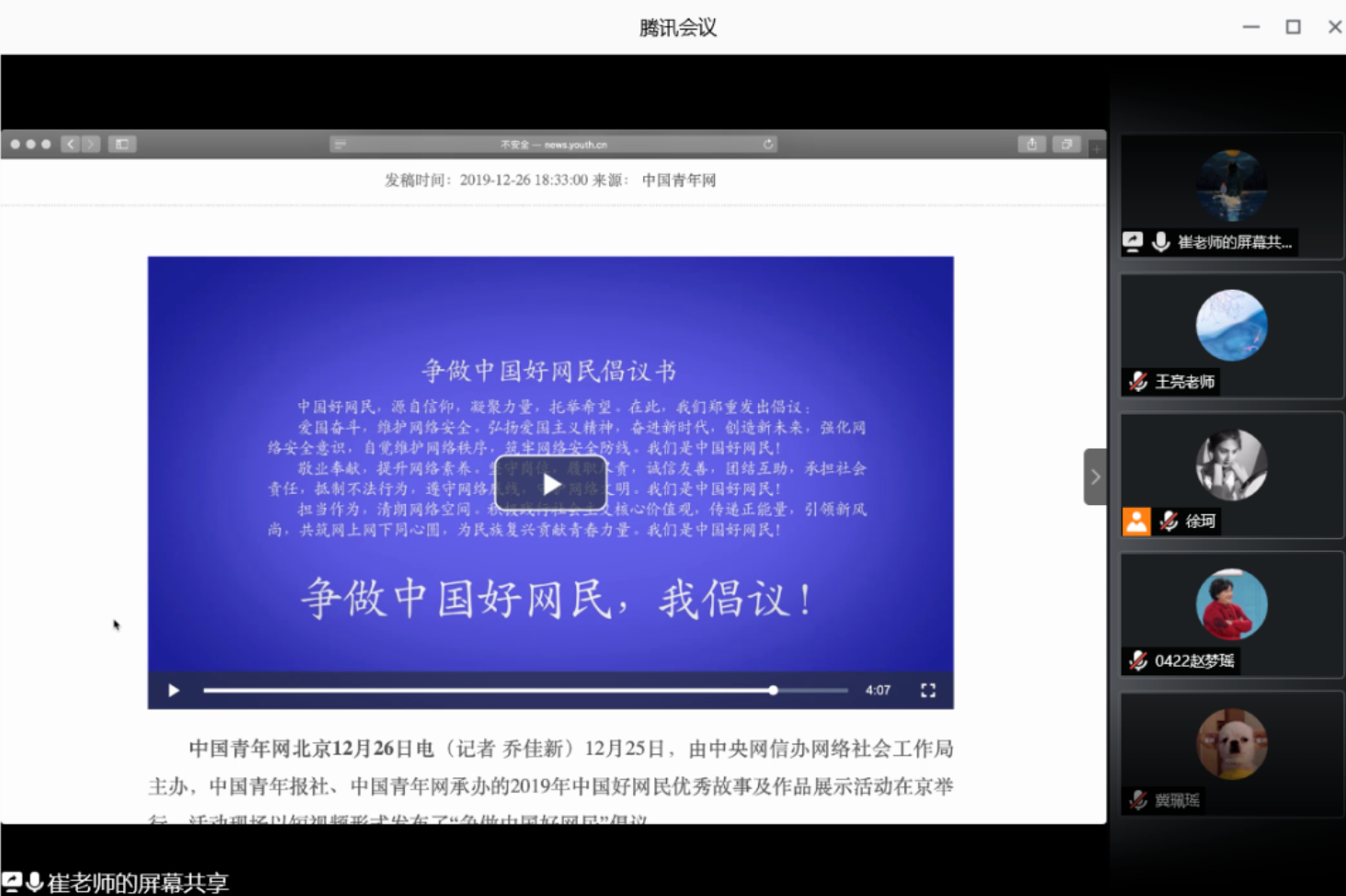 在活动中,明升M88 师生通过腾讯会议共同观看了“争做中国好网民”的倡议视频,共同学习了2019年中国互联网上涌现出的好网民优秀故事和优秀作品,引导大家朝优秀看齐,向优秀学习,争当中国好网民。在各班班级群里,大家围绕“如何做中国好网民”展开讨论,用一条条发言组成大接龙。此外,同学们以班为单位签订自觉遵守《文明上网自律公约》承诺书,共同立下庄严承诺。