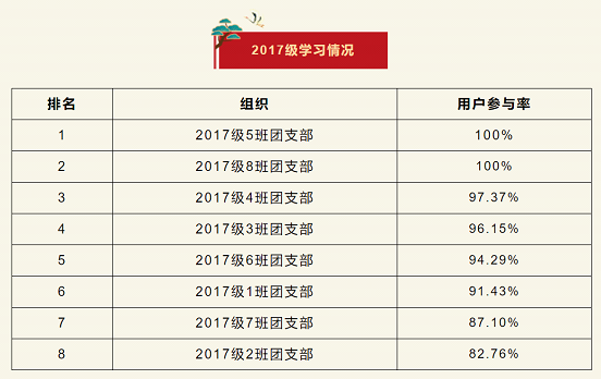 在上一期“青年大学习”网上主题团课的学习中,2017级5班、8班团支部位居榜首,2017级4班团支部排名第二。