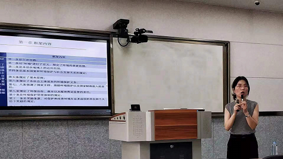 李老师以近期西安垃圾分类的施行为切入点,主要从框架结构和主要亮点两个方面来为大家解读。首先老师通过表格以及饼状图的形式为大家介绍了新、旧《环境保护法》的区别,让同学们对环保法有了宏观的了解。随后,老师对新《环境保护法》各个章节分别进行解析,详细分析与旧《环境保护法》的异同,让大家更加深入地理解了新《环境保护法的》具体内容。