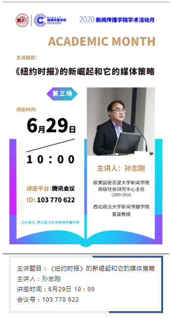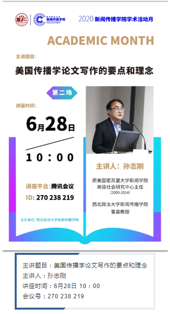 6月28日、6月29日,每天10:00,原密苏里大学新闻明升M88 高级社会研究中心主任孙志刚教授在腾讯会议开讲。届时欢迎各位同学参加。