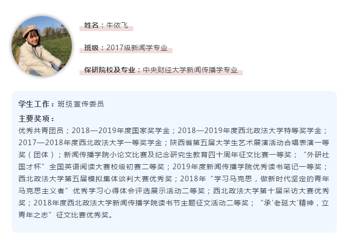 大学对很多人来说,初入小社会、离开父母庇护、独自面对成长……这些对于牛依飞来说也是如此。但与大多数人不同的是,在大学刚开始她就确定了考研深造这条路。“在见识了他人多元化的方向选择之后,我更加清楚自己想要成为怎样的大人,以及实现这一目标所需要积累的能力。”大三上学期,牛依飞发现自己的成绩一直稳定在专业前列。2020年寒假期间,她在对自身情况做出综合评估之后,便开始着手准备保研的各项事宜。