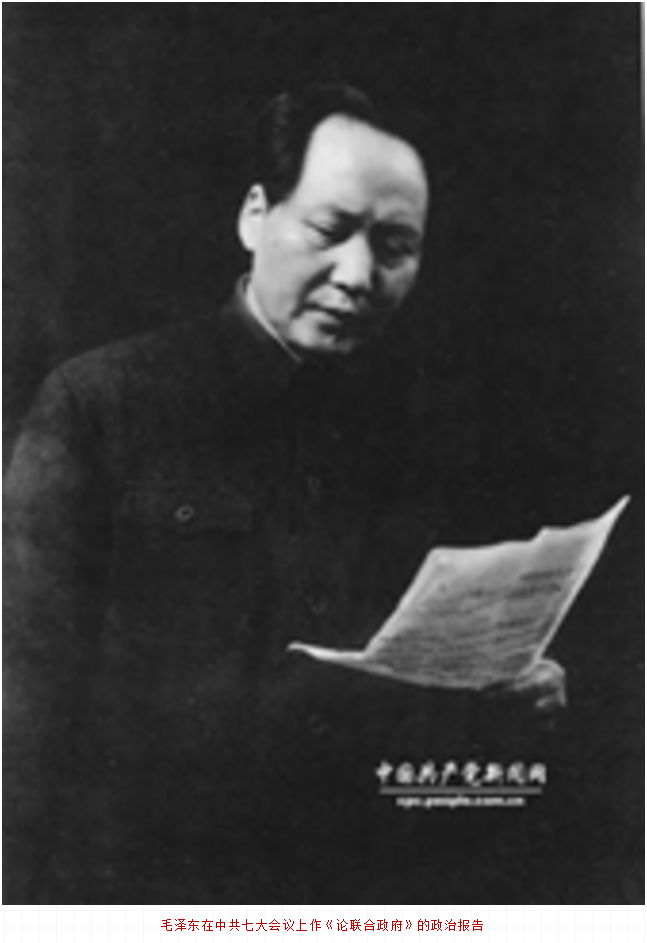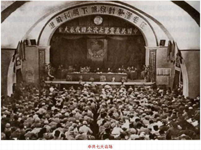 在德国法西斯面临彻底覆灭和中国抗战接近胜利的前夜,1945年4月23日至6月11日,中国共产党第七次全国代表大会在延安隆重召开。出席大会的正式代表544人,候补代表208人,代表全国121万党员。毛泽东在会上作《论联合政府》的政治报告,刘少奇作《关于修改党章的报告》,朱德作《论解放区战场》的军事报告,周恩来作《论统一战线》的讲话,任弼时、陈云等在会上发了言。