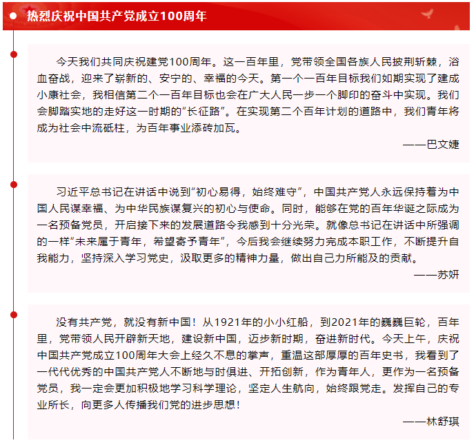 7月1日上午,庆祝中国共产党成立100周年大会在北京天安门广场隆重举行。明升M88 学生党支部同学认真学习了习近平总书记在大会上的重要讲话,大家围绕实际分享心得,会议由学生党支部书记刘璇主持。