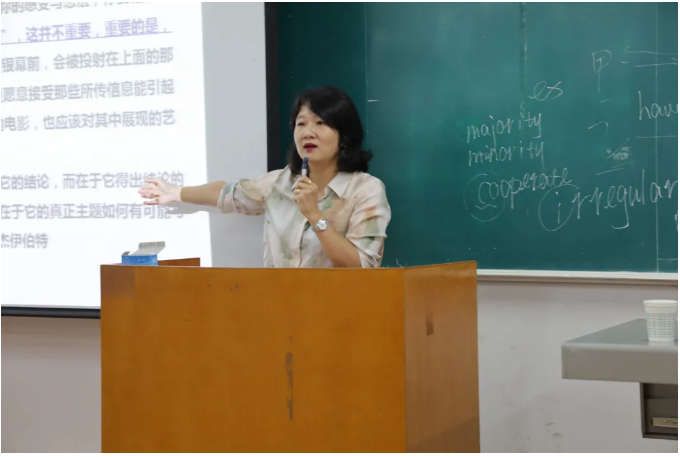 郭梅老师以“你什么时候喜欢上看电影的”为切入点,让同学们回忆看电影时的场景。她认为,电影是一门艺术,电影的内容是时代的投射,以什么样的心态面对电影很重要,一部电影之所以好,并非在于你赞同它的结论,而在于它得出结论的过程。在讲座上,她以德国电影《窃听风暴》为例,讲述其试听语言和历史背景,并表示电影永远不单纯是娱乐,在消费、娱乐的同时,我们必然经历着某种文化的、社会的、政治的、历史的教化或告诫。同时她提到要提升看电影的趣味,努力成为一个有趣味并能欣赏更多趣味的影迷。