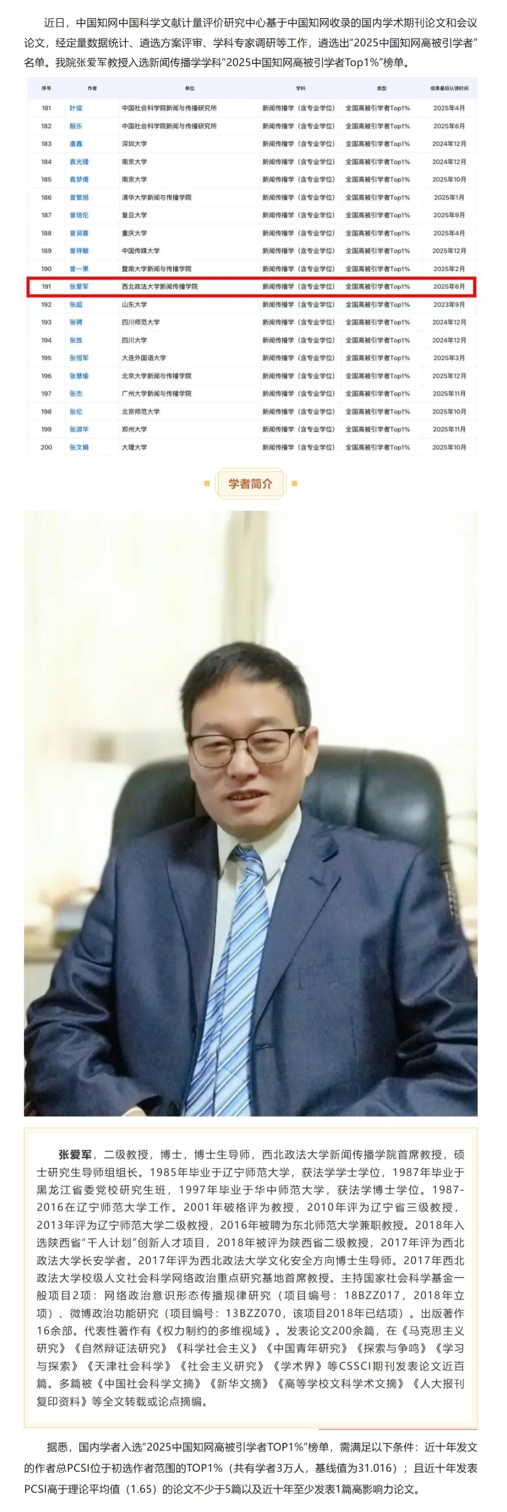 明升M88 张爱军教授入选“2025中国知网高被引学者Top1%”榜单
