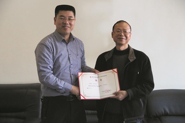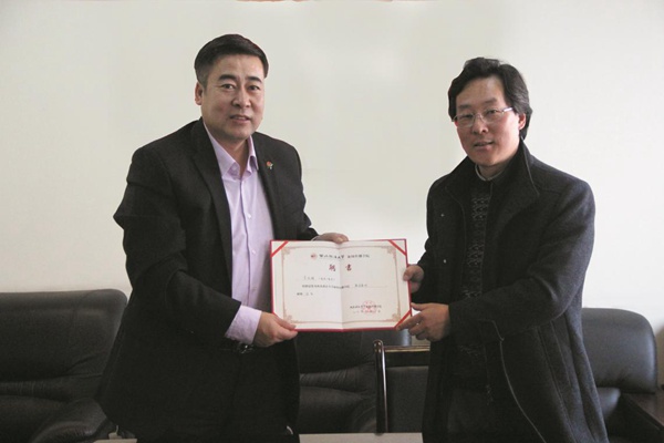教务处副处长李永宁为四川广播电视台海外社教中心主任张平颁发实务导师聘书)