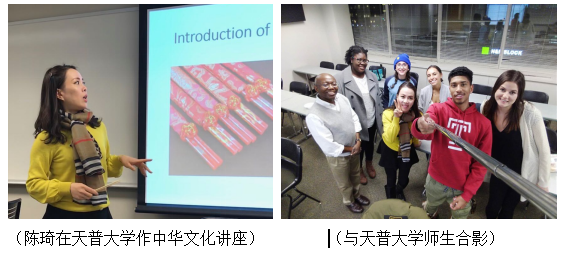 在科研和学习之外,陈琦老师也不忘作为一名学者对中华文化的传播。在天普大学应邀为本科生进行了数次关于中华传统文化的讲座,激发了美国年轻人对中国这片神奇土地的向往。