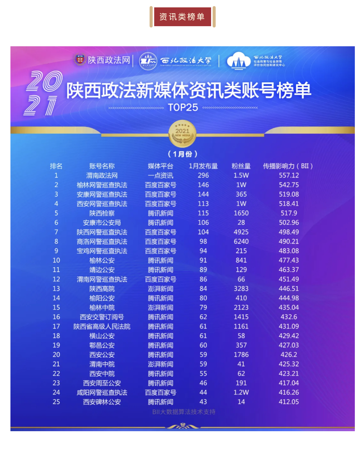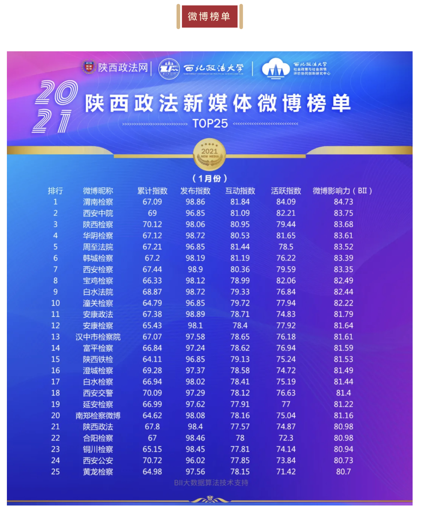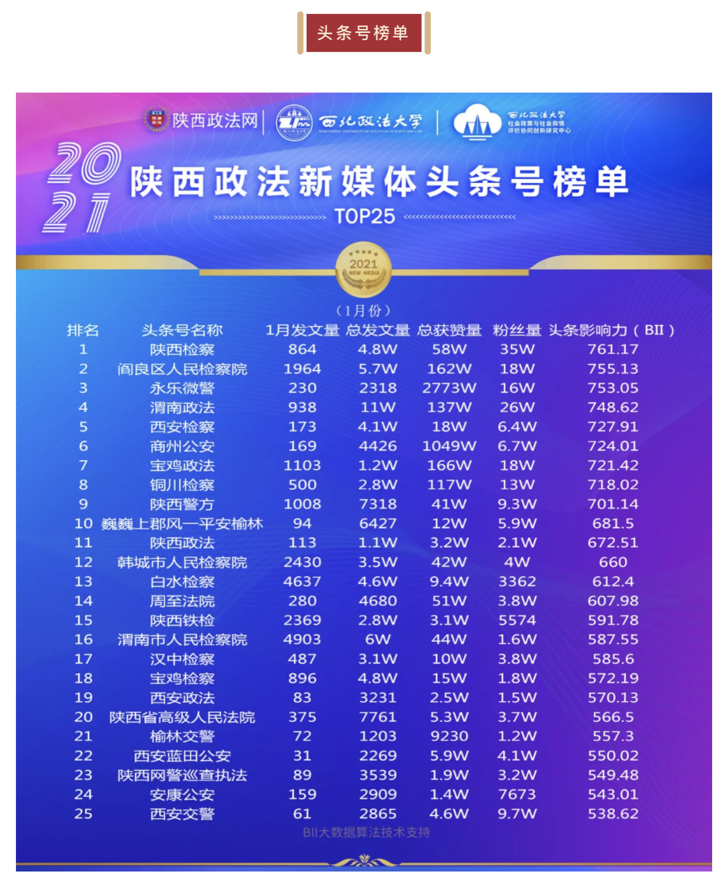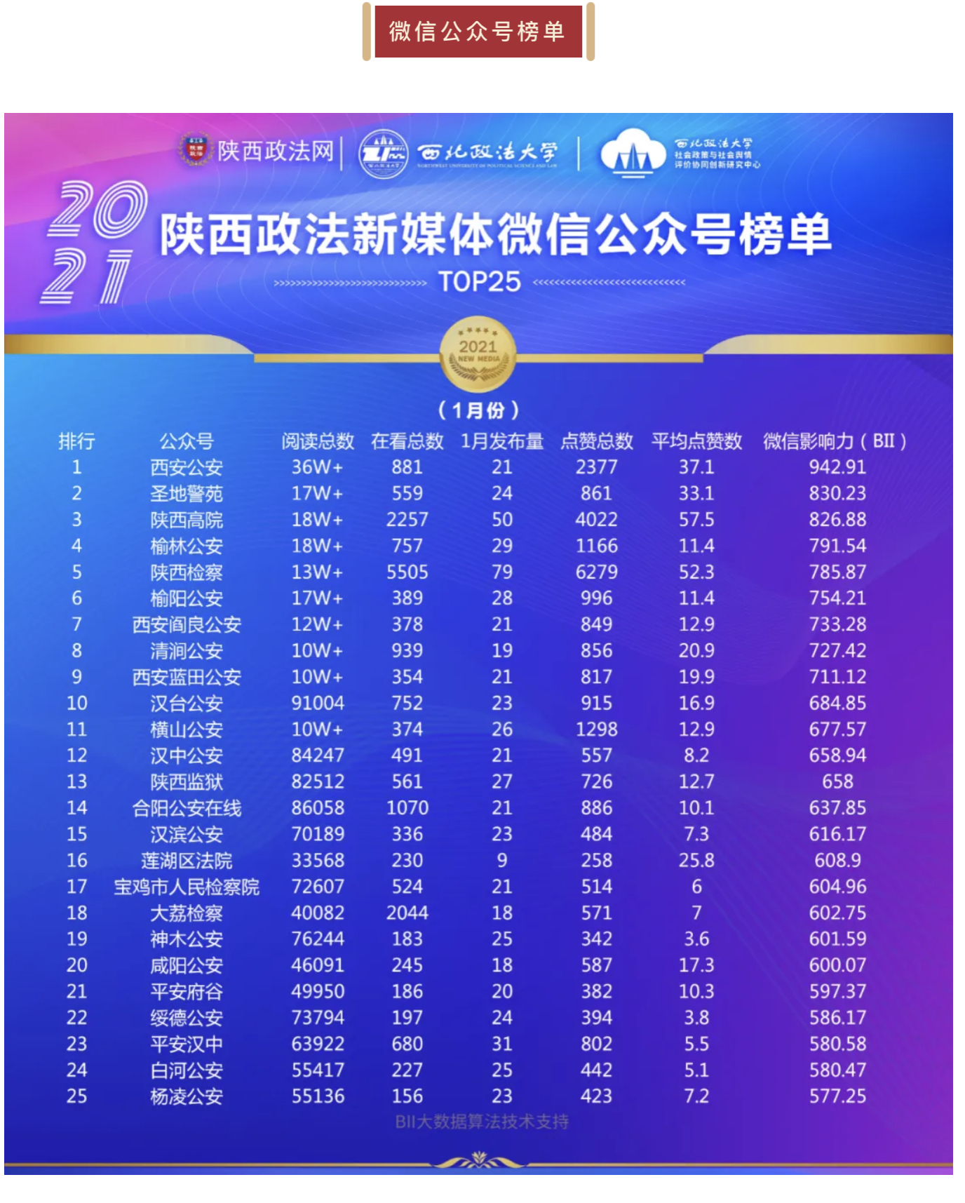 陕西政法新媒体账号2021年1月榜单