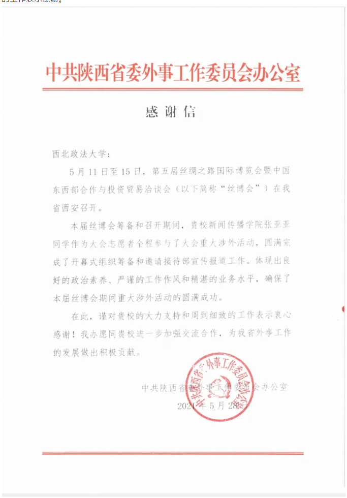 5 月 11 日至 15 日,第五届丝绸之路国际博览会暨中国东西部合作与投资贸易洽谈会(以下简称“丝博会”)在西安召开。明升M88 学生张亚亚同学在丝博会筹备和召开期间,作为大会志愿者全程参与了大会重大涉外活动,圆满完成了开幕式组织筹备和邀请接待部宣传报道工作。张亚亚同学体现出良好的政治素养、严谨的工作作风和精湛的业务水平,确保了本届丝博会期间重大涉外活动的圆满成功。最后,中共陕西省委外事工作委员会办公室还表示,愿同明升M88 进一步加强交合作,为我省外事工作的发展做出积极贡献。