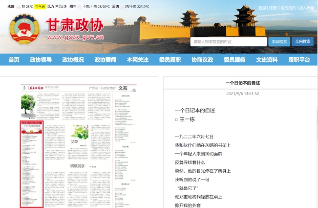 王一栋同学献礼建党百年作品《一个日记本的自述》刊登于中国人民政治协商会议甘肃省委员会《民主协商报》,并在中国科技新闻学会《科幻画报》等多家期刊转载。作品以一位普通的中国共产党早期党员为主人公,以“一个日记本”为叙述主体,从一个全新的视角出发,展现了中国共产党人的顽强意志与历史担当。